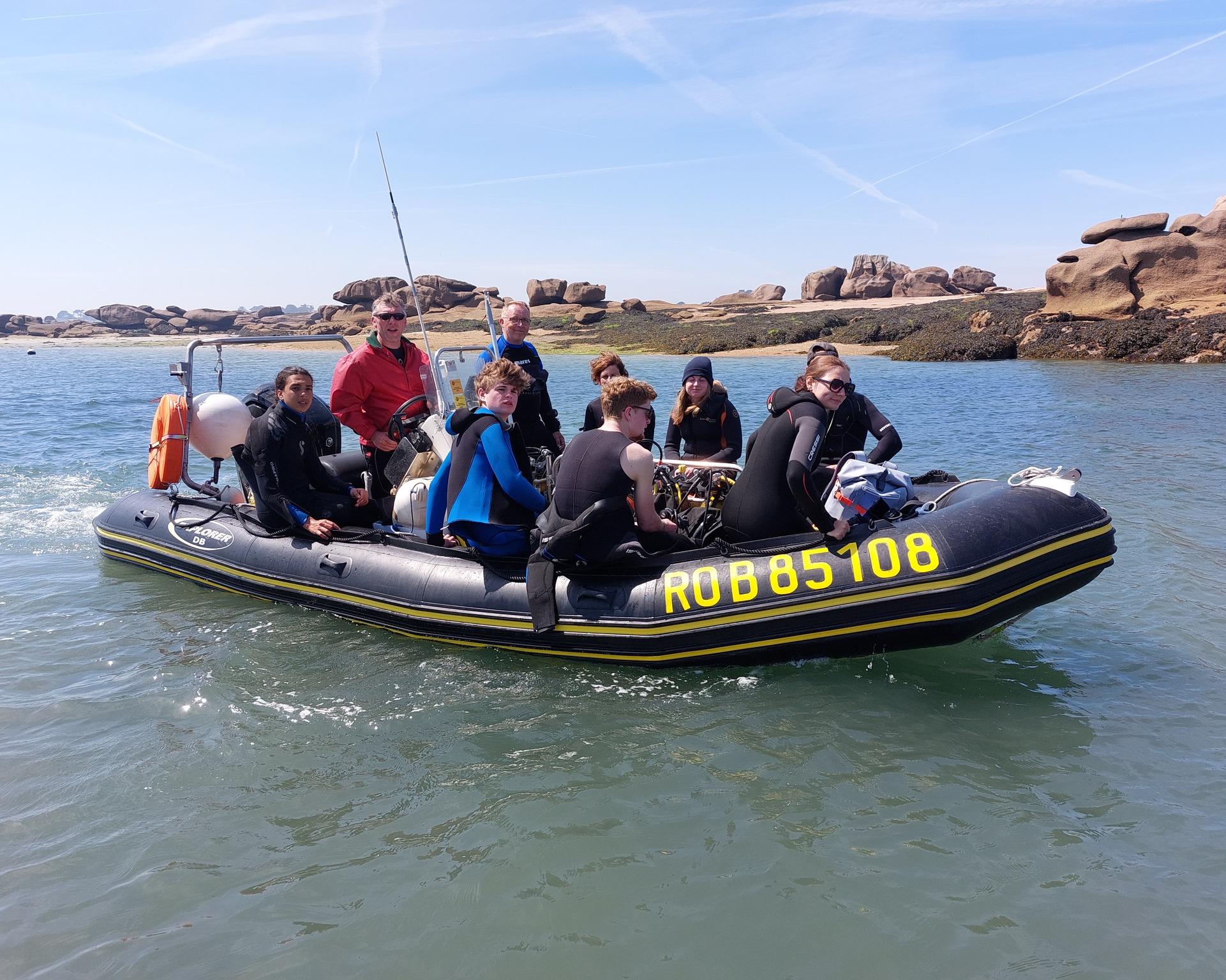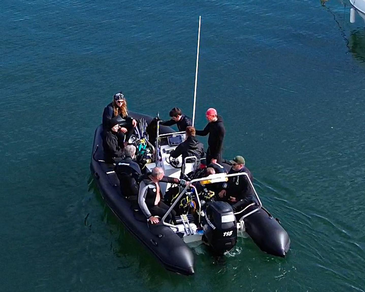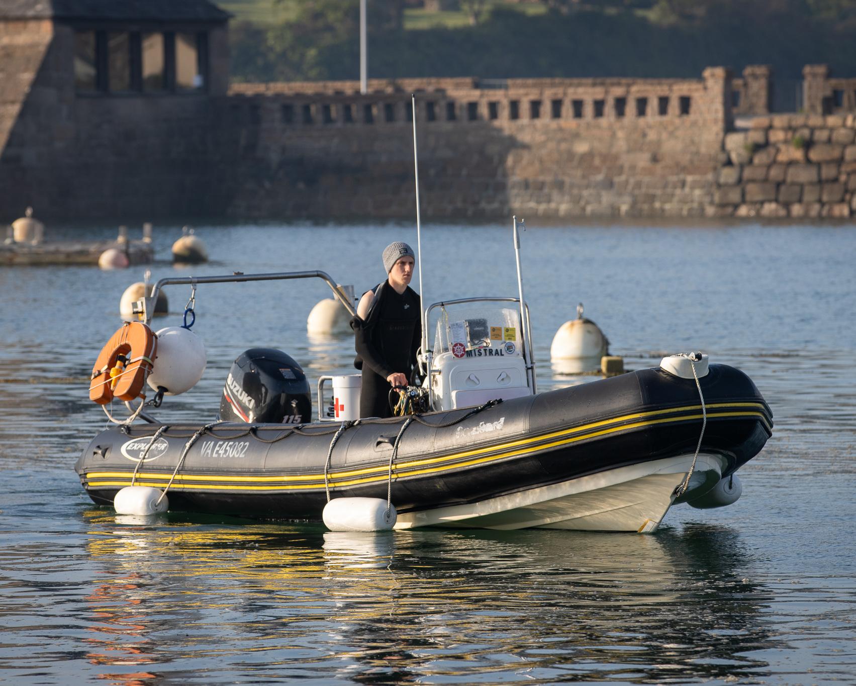 Semi-rigide BOMBARD DB600, Année 2003, avec un moteur MERCURY de 115 CV 4 temps changé en 2018. Bateau autonome permettant de transporter 10 plongeurs équipés.